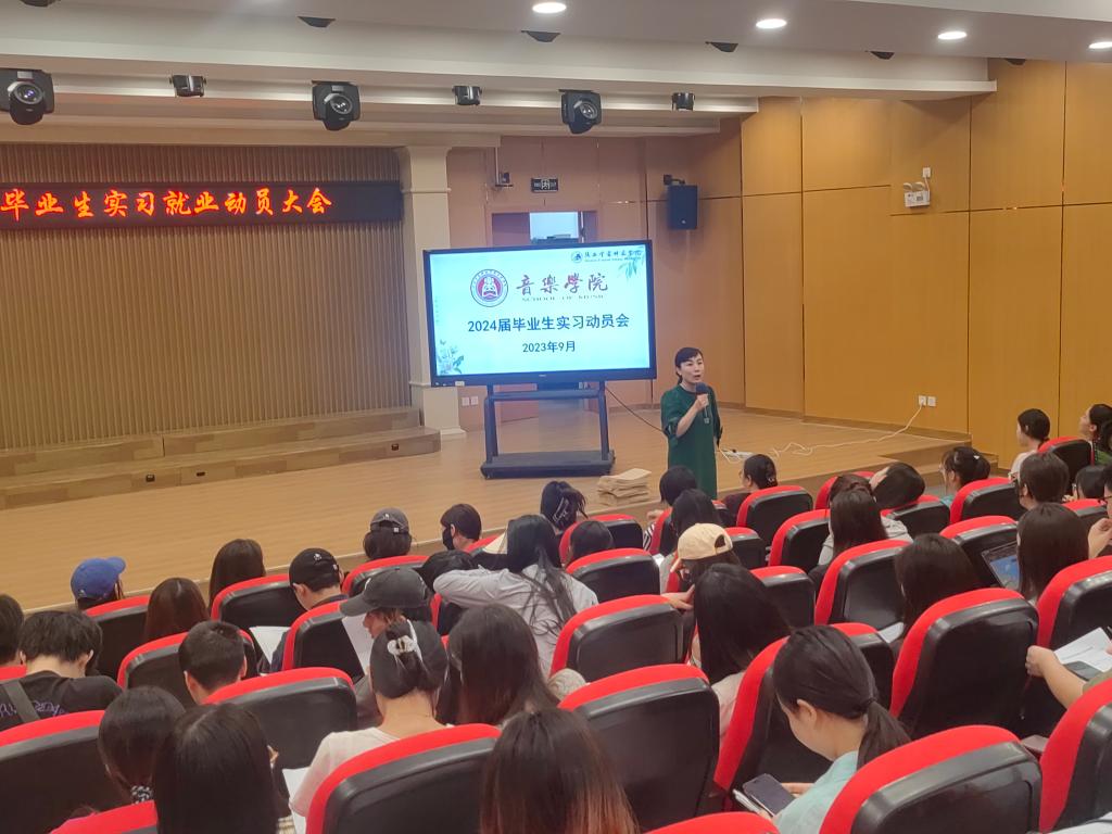 为帮助2024届毕业生将专业理论知识运用到实践中,明确实习要求,把握实习方案,引导同学们做好实习前的各项准备,确保毕业生实习、就业工作的顺利展开,9月15日上午音乐学院在我校大学生艺术教育中心举办了教育实习就业动员大会。实习带队教师、毕业班辅导员及学院2024届毕业生参加本次会议。
