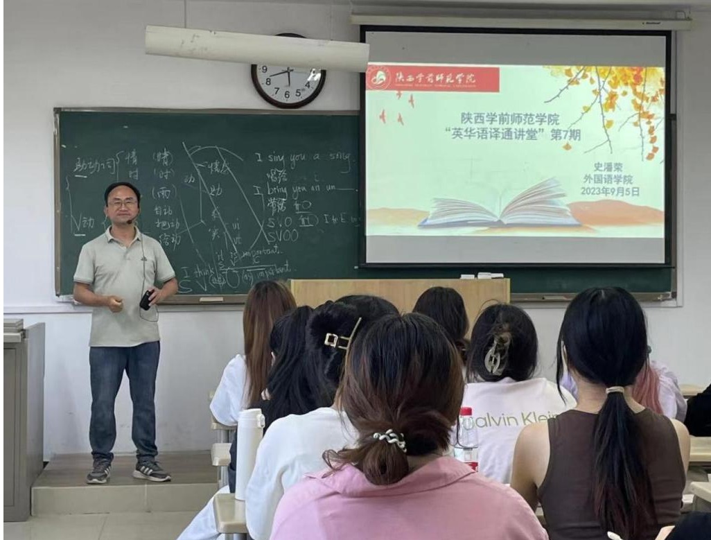 2023年9月5日,球友会(中国)外国语学院举办“英华语译通讲堂”第7期讲座,主讲嘉宾为中国国学双语研究会会员、陕西译协理事、西京大学史潘荣老师。史老师结合汉英笔译实践翻译任务,对翻译主体、翻译方法、翻译类型、翻译目的等方面进行了针对性讲授,21级、22级翻译系全体本科生在现场聆听报告。讲座由翻译系主任吴迪老师主持。